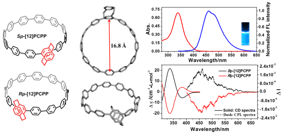 主客化學和超分子化學的興起和蓬勃發(fā)展為構建各種超分子結(jié)構提供了機會。其中,大環(huán)與客體分子的分級自組裝可以從根本上改變其動力學和化學行為。近年來,一系列諸如環(huán)中環(huán)、籠中籠、洋蔥型、球中球及俄羅斯套娃型等二元/三元絡合物也被相繼報道。以環(huán)對苯撐(CPP)為代表的碳納米環(huán)由于其彎曲π共軛空腔,使它成為構建多元超分子體系的優(yōu)秀主體之一。當碳納米環(huán)被一個更大的主體包結(jié)時,它可以發(fā)生角色轉(zhuǎn)變而成為客體分子,這為二元絡合物的構建提供了一個機會。近年來,理論和實驗的研究也證明了較大的碳納米環(huán)可以嵌套較小的環(huán)形成二元絡合物。但是,基于碳納米環(huán)的手性三元絡合物的構建仍具有較大的挑戰(zhàn)性,迄今尚未有報道。