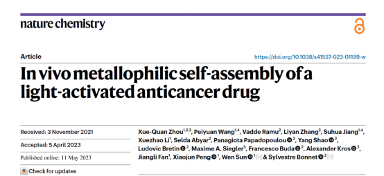 論文信息:In vivo metallophilic self-assembly of a light-activated anticancer drug, Xue-Quan Zhou, Peiyuan Wang, Vadde Ramu, Liyan Zhang, Suhua Jiang, Xuezhao Li, Selda Abyar, Panagiota Papadopoulou, Yang Shao, Ludovic Bretin, Maxime A. Siegler, Francesco Buda, Alexander Kros, Jiangli Fan, Xiaojun Peng, Wen Sun* & Sylvestre Bonnet*,nature chemistry 2023, 10.1038/s41557-023-01199-w.