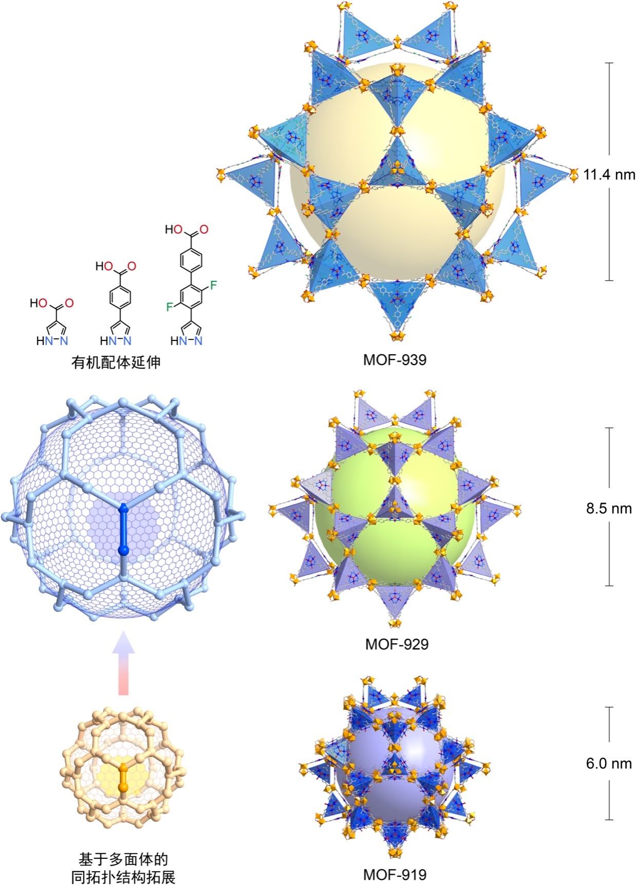 圖一.基于具有高拓展效率多面體的MOF晶體同拓?fù)浣Y(jié)構(gòu)合成,在MOF-939中獲得創(chuàng)紀(jì)錄的11.4 nm籠狀孔道。