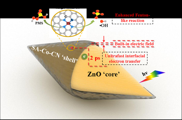 該課題組制備了ZnO(核)和超薄單原子Co-CN(殼)p-n異質(zhì)結(ZnO@SA-Co-CN),該異質(zhì)結具有類似于自然界中光合作用的Z型電子傳輸路徑,此外具有較大的界面面積和暴露大量的單原子Co活性位點。該異質(zhì)結在類光Fenton反應中具有優(yōu)異的催化活性,可通過活化過一硫酸鹽快速去除水中各種新型有機污染物。采用飛秒瞬態(tài)吸收光譜(fs-TAS)研究了該體系中的電子轉移過程及反應動力學,研究表明在ZnO@SA-Co-CN中具有光生電子轉移到單原子Co的超快電子轉移過程(2 ps),異質(zhì)結間的內(nèi)建電場促進了該電子轉移過程,進一步加速了表面Co活性位點的氧化還原反應。這項工作為合理設計新型單原子光催化劑提供了新思路和新方向,同時為環(huán)境修復領域做出了重要貢獻。