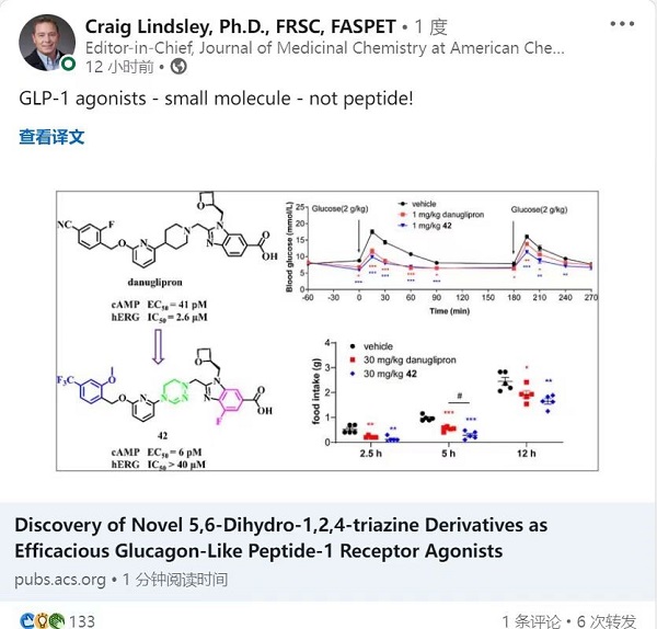 2023年6月7日,中國科學(xué)院上海藥物研究所沈建華課題組和謝欣課題組合作,在Journal of Medicinal Chemistry上發(fā)表了題為“Discovery of Novel 5,6-Dihydro-1,2,4-triazine Derivatives as Efficacious Glucagon-Like Peptide 1 Receptor Agonists”的文章,報道了合作團(tuán)隊在小分子GLP-1受體激動劑的研究中所取得的階段性進(jìn)展。