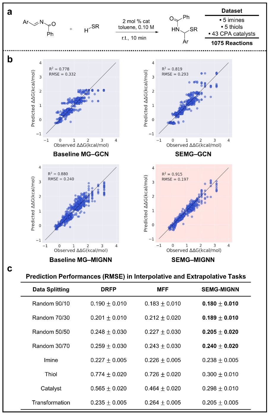 SEMG-MIGNN被應(yīng)用于Pd催化Buchwald-Hartwig偶聯(lián)反應(yīng)的產(chǎn)率預(yù)測(cè)以及手性磷酸催化的亞胺加成反應(yīng)的對(duì)映選擇性預(yù)測(cè)(圖2)中。隨機(jī)劃分的預(yù)測(cè)結(jié)果表明,SEMG-MIGNN策略在產(chǎn)率和對(duì)映選擇性的預(yù)測(cè)上均展示出了良好的準(zhǔn)確性。此外,SEMG-MIGNN模型對(duì)于訓(xùn)練集中未出現(xiàn)的底物和催化劑表現(xiàn)出了優(yōu)秀的外推預(yù)測(cè)能力,在大多數(shù)任務(wù)中超過(guò)了常見(jiàn)的反應(yīng)建模手段。