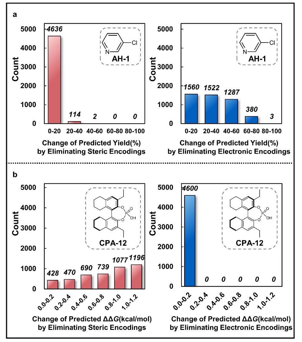 SEMG-MIGNN模型在高預(yù)測(cè)精度的同時(shí),提供了追溯立體效應(yīng)及電子效應(yīng)影響的評(píng)估能力(圖3)。在Pd催化的Buchwald-Hartwig反應(yīng)中,位阻信息編碼的消除對(duì)產(chǎn)率預(yù)測(cè)影響較小,而電子信息編碼的消除則影響較大。這表明電子效應(yīng)對(duì)該反應(yīng)產(chǎn)率起主導(dǎo)作用。而對(duì)于亞胺的不對(duì)稱加成反應(yīng)則恰恰相反,位阻信息對(duì)立體選擇性的影響尤其顯著,這也與之前該反應(yīng)的機(jī)理模型Goodman Model一致。上述結(jié)果充分體現(xiàn)了化學(xué)信息的針對(duì)性嵌入對(duì)于模型化學(xué)可解釋性的提升。