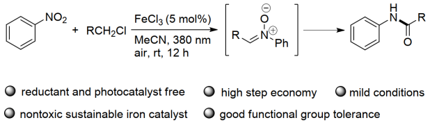 張方林課題組長期致力于光催化和金屬催化領(lǐng)域,針對N-芳基酰胺的綠色合成,設計了一種在環(huán)境友好的簡單條件下,通過可見光誘導的鐵催化,以商業(yè)上廉價的豐富的硝基芳烴和氯代烷烴為起始原料,高效快速地合成了一系列N-芳基酰胺。該方法具備原子經(jīng)濟高、官能團耐受性良好、無需額外添加還原劑和光催化劑等優(yōu)點。
