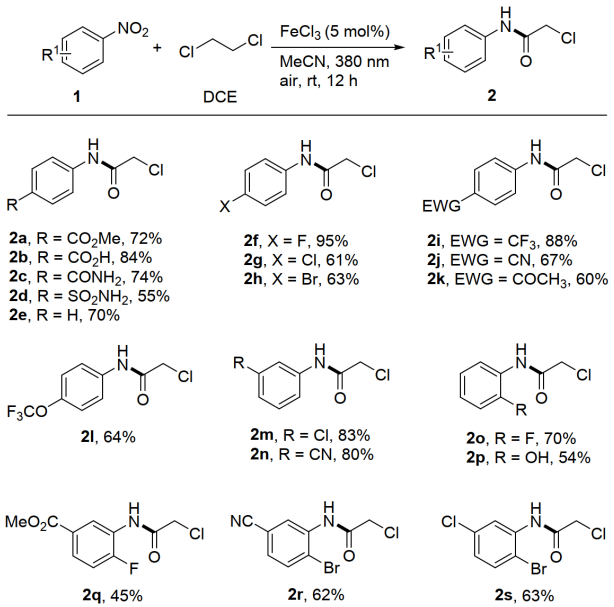 該方法可以和1,2-二氯乙烷(DCE)直接反應,制備出一系列氯代酰胺。并且該方法受硝基芳烴上取代基的影響較小,適用于大多數(shù)硝基芳烴。