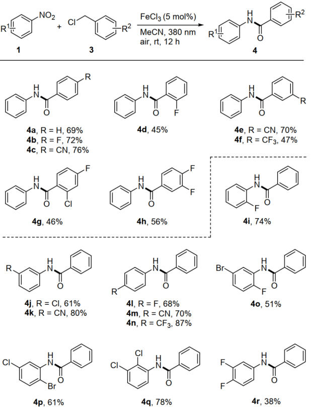 此外,硝基芳烴還可以與氯化芐反應,構(gòu)建出一系列芳基酰胺。