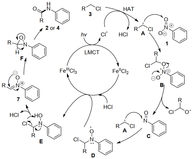 圖2?光誘導鐵催化通過硝基化合物和氯代烷烴合成酰胺(來源:Green Chemistry)