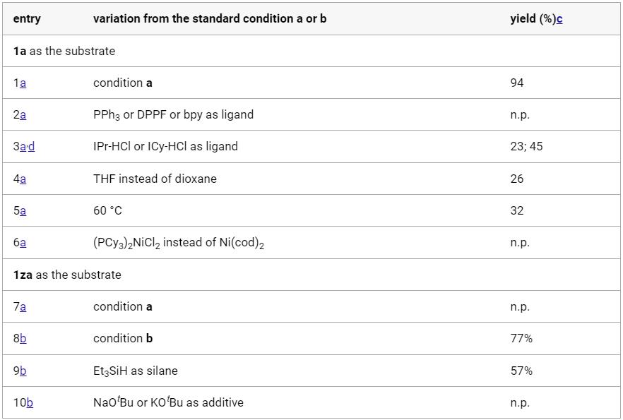 傳統(tǒng)的苯酚衍生物,包括活化的磺酸鹽、芳基羧酸鹽、芳基醚,甚至不受保護(hù)的酚,被廣泛用作親電試劑;通過(guò)Csp2?O鍵的活化,在(還原)交叉偶聯(lián)反應(yīng)中用于構(gòu)建各種碳-碳和碳-雜原子鍵。然而,這些轉(zhuǎn)化總是產(chǎn)生化學(xué)計(jì)量的廢物。苯并呋喃作為功能分子中的關(guān)鍵骨架,可以從各種簡(jiǎn)單的原料制備,只需一兩步即可。苯并呋喃開環(huán)轉(zhuǎn)化為構(gòu)建鄰烯基/烷基取代苯酚衍生物提供了一種高效且原子經(jīng)濟(jì)的策略。然而,由于其較高的C-O鍵強(qiáng)度,空間位阻,并芳香穩(wěn)定,這種轉(zhuǎn)化相對(duì)稀少,特別是2,3-二取代苯并呋喃。盡管取得了這些進(jìn)展,但苯并呋喃的直接開環(huán)氫化的研究尚未取得進(jìn)展。這主要是因?yàn)殚_環(huán)產(chǎn)物鄰羥基苯乙烯中的末端C-C雙鍵反應(yīng)活性更高,極易發(fā)生過(guò)度還原。例如,游書力教授小組報(bào)道了一種溫和的銅催化2,3-非取代苯并呋喃與硅烷的開環(huán)反應(yīng),然后進(jìn)行對(duì)映選擇性氫胺化反應(yīng),得到了手性N,N-二芐基氨基酚,且反應(yīng)需要過(guò)量的苯并呋喃的底物。受到Martin、Chatani和Hartwig等課題組關(guān)于鎳催化的C-O鍵活化的啟發(fā),作者認(rèn)為這種策略可以應(yīng)用于苯并呋喃的化學(xué)選擇性開環(huán)氫化?;诖耍疚膱?bào)道了以硅烷為還原劑的鎳催化苯并呋喃開環(huán)反應(yīng)。 圖1. 苯并呋喃開環(huán) 作者首先以苯并呋喃1a和三乙基硅烷2aa作為模板底物進(jìn)行條件篩選,在最優(yōu)條件下可獲得94%產(chǎn)率的開環(huán)氫化產(chǎn)物3aa。另外,通過(guò)更換配體、硅烷及提高反應(yīng)溫度、濃度等,也可以使大位阻的底物2-萘基苯并呋喃開環(huán),產(chǎn)率77%(圖2)。 aReaction condition a: 1a/1za (0.1 mmol), Et3SiH (23.2 mg, 0.2 mmol), Ni(cod)2 (2.7 mg, 0.01 mmol), PCy3 (5.6 mg, 0.02 mmol) in 1 mL 1,4-dioxane at 80°C for 8 h under N2 atmosphere. bReaction condition b: 1za (0.1 mmol), tBuMe2SiH (34.8 mg, 0.3 mmol), Ni(cod)2 (2.7 mg, 0.01 mmol), ICy-HCl (4.0 mg, 0.015 mmol), LiOtBu (0.1 mmol) in 0.5 mL 1,4-dioxane at 130°C for 24 h under N2 atmosphere. cGC yield with n-dodecane as an internal standard. d20 mol % LiOtBu was added. 圖2. 條件優(yōu)化 苯并呋喃開環(huán)氫化反應(yīng)的底物范圍廣泛,對(duì)于其他三級(jí)硅烷也能有良好的收率。值得注意的是,大位阻底物2,3-取代的苯并呋喃也可以實(shí)現(xiàn)開環(huán)反應(yīng)(圖3)。 圖3. 苯并呋喃開環(huán)氫化的底物范圍 為了進(jìn)一步了解反應(yīng)機(jī)理,作者進(jìn)行了一系列控制實(shí)驗(yàn),排除了Ni(0)對(duì)苯并呋喃的C-O鍵直接氧化加成,EPR實(shí)驗(yàn)證明了Ni(I)的存在,DFT計(jì)算表明是Ni(I)-H插入苯并呋喃再β-O消除來(lái)實(shí)現(xiàn)苯并呋喃開環(huán)轉(zhuǎn)化(圖4、5)。 圖4. 控制實(shí)驗(yàn)和KIE實(shí)驗(yàn) 圖5. DFT計(jì)算 由于Ni-H可以進(jìn)一步遷移插入到氫化開環(huán)產(chǎn)物的烯烴中,作者認(rèn)為烯烴的硅氫化反應(yīng)可以與苯并呋喃氫化開環(huán)反應(yīng)相結(jié)合。這種轉(zhuǎn)化的關(guān)鍵挑戰(zhàn)之一是控制鎳催化支鏈氫硅化、直鏈氫硅化和脫氫硅化反應(yīng)的化學(xué)選擇性。作者經(jīng)過(guò)細(xì)致的條件優(yōu)化,可以實(shí)現(xiàn)2,3-未取代苯并呋喃的開環(huán)支鏈氫硅化反應(yīng),生成所需的支鏈烷基硅烷苯酚衍生物。有趣的是,對(duì)于3-芳基/烷基取代的苯并呋喃,在SICy-HCl作為配體存在的條件下,這些轉(zhuǎn)化選擇性地提供了產(chǎn)率良好的鄰位線性烷基硅烷苯酚衍生物。此外,在10 mol% Ni(cod)2、20 mol% PCy3和3當(dāng)量的1-辛烯作為氫受體的作用下,可以實(shí)現(xiàn)2,3-未取代苯并呋喃的開環(huán)脫氫硅化合成所需的乙烯基硅烷(圖6)。 圖6. 苯并呋喃開環(huán)進(jìn)一步串聯(lián)反應(yīng)的底物范圍 克級(jí)反應(yīng)和產(chǎn)物衍生化證明了該方法的實(shí)用性(圖7)。 圖7. 克級(jí)反應(yīng)以及衍生化 研究總結(jié) 總之,該團(tuán)隊(duì)開發(fā)了一種高效、穩(wěn)定的苯并呋喃的鎳催化開環(huán)反應(yīng),簡(jiǎn)化了一系列鄰位功能化苯酚衍生物的制備。該方法底物范圍廣、條件溫和、化學(xué)選擇性好。DFT計(jì)算和動(dòng)力學(xué)實(shí)驗(yàn)表明,苯并呋喃的C-O活化是通過(guò)插入Ni-H和消除β-O來(lái)實(shí)現(xiàn)的。進(jìn)一步對(duì)苯并呋喃進(jìn)行級(jí)聯(lián)開環(huán)轉(zhuǎn)化,可得到支鏈/直鏈烷基硅烷和烯基硅烷取代苯酚衍生物。 該工作以“Nickel-Catalyzed Ring-Opening of Benzofurans for the Divergent Synthesis of ortho-Functionalized Phenol Derivatives”為題發(fā)表在《ACS Catalysis》上。文章第一作者為華南理工大學(xué)博士后呂昌輝和碩士研究生林躍萍,通訊作者為華南理工大學(xué)黃良斌教授和南京大學(xué)王敏燕教授。 該研究工作得到了制漿造紙工程國(guó)家重點(diǎn)實(shí)驗(yàn)室(2020C02)、國(guó)家自然科學(xué)基金(Nos. 21971074、22001076)、廣東省自然科學(xué)基金(Nos.A1515010006、2021A1515010159)、中央高?;究蒲袠I(yè)務(wù)費(fèi)專項(xiàng)資金(Nos.JQ04、2020ZYGXZR035)的資助。 文章鏈接:https://pubs.acs.org/doi/10.1021/acscatal.2c04442
