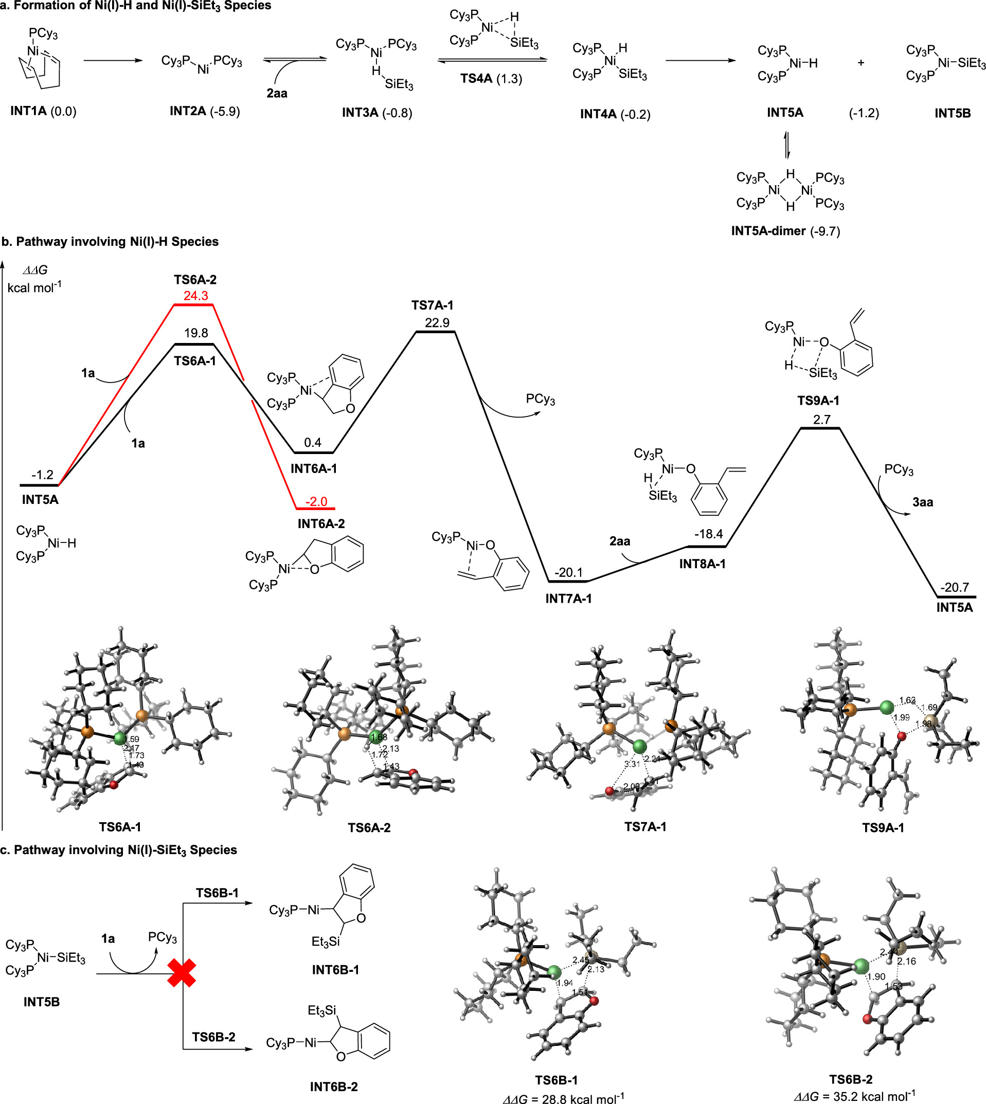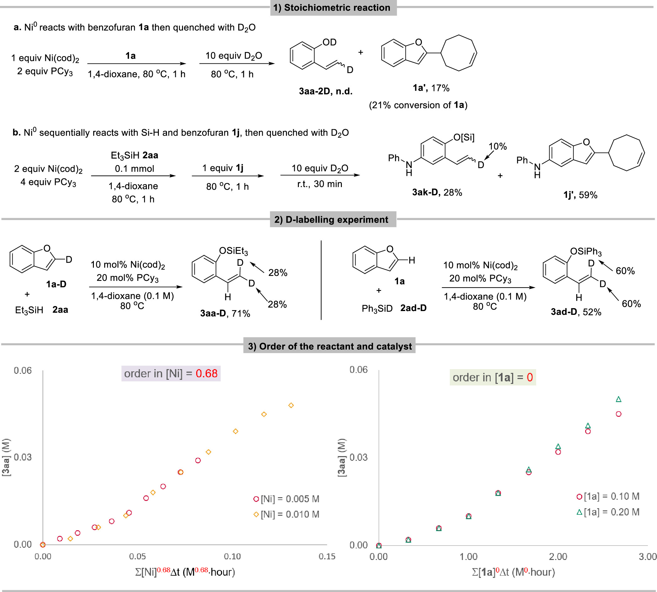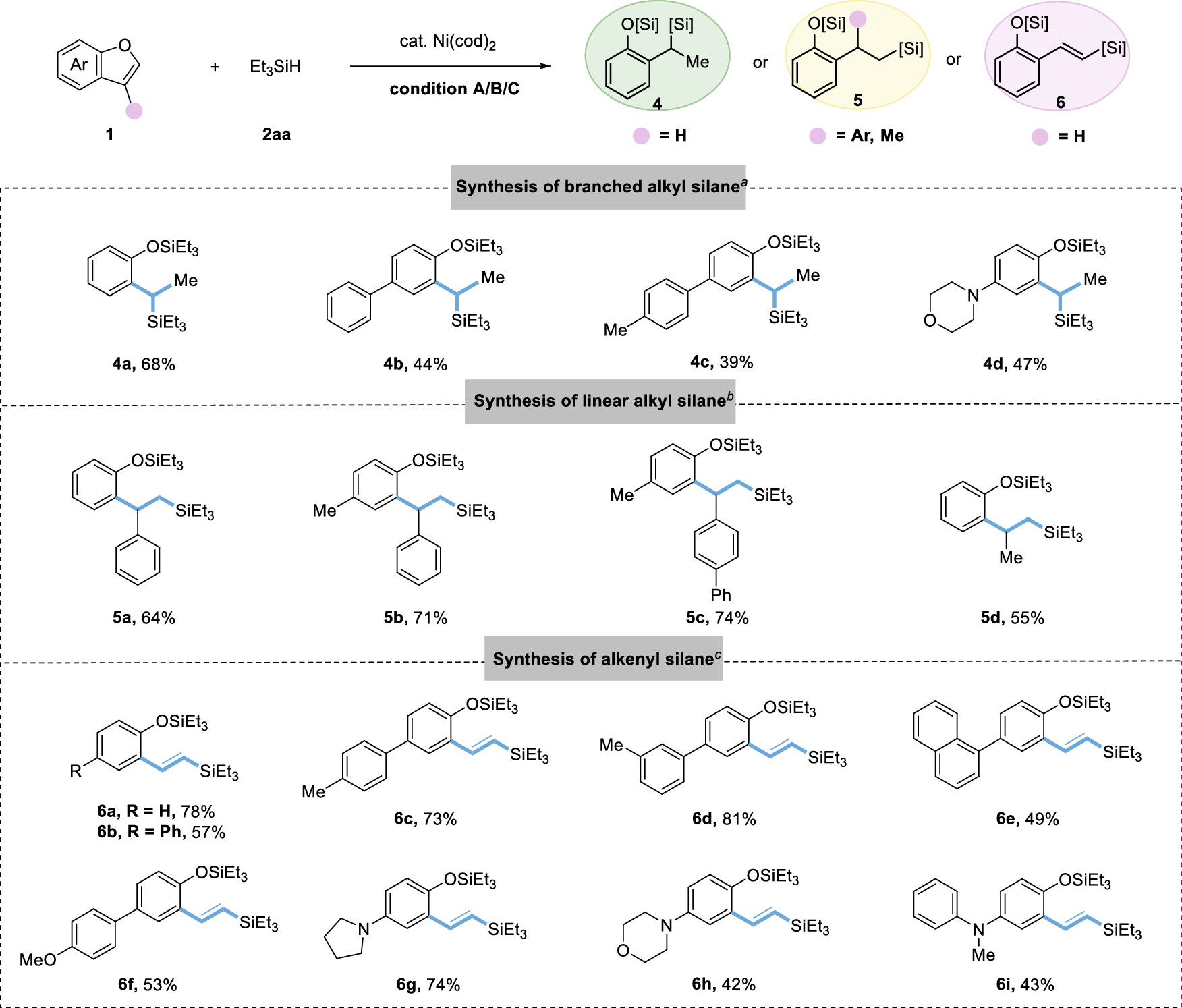 苯并呋喃的開環(huán)反應(yīng)是一種很有價(jià)值但尚未開發(fā)的苯酚衍生物的制備方法。近日,華南理工大學(xué)制漿造紙工程國(guó)家重點(diǎn)實(shí)驗(yàn)室黃良斌教授課題組及南京大學(xué)王敏燕教授課題組報(bào)道了鎳催化苯并呋喃與硅烷的開環(huán)反應(yīng),選擇性地得到了鄰烯基、支鏈烷基硅烷和烯基硅烷取代的苯酚衍生物。作者通過(guò)控制實(shí)驗(yàn)和DFT計(jì)算驗(yàn)證Ni-H遷移插入再β-O消除來(lái)實(shí)現(xiàn)苯并呋喃的C-O鍵活化,但不是通過(guò)Ni(0)直接氧化加成到苯并呋喃的C-O鍵。進(jìn)一步的區(qū)域選擇性氫硅化或脫氫硅化是通過(guò)Ni(I)-H或Ni(I)-[Si]中間體,形成支鏈/直鏈性烷基硅烷或烯基硅烷取代的苯酚衍生物。