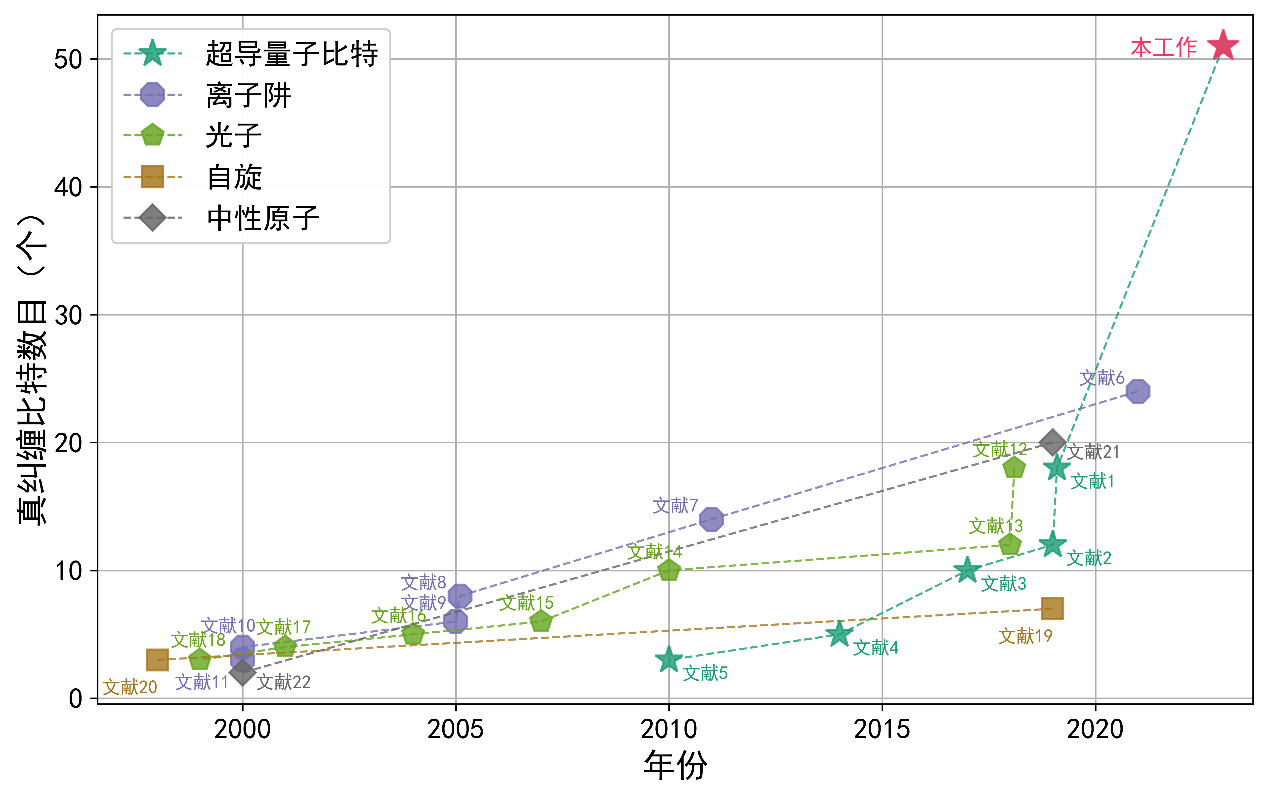 圖 1 量子真糾纏態(tài)比特數目的發(fā)展歷史。