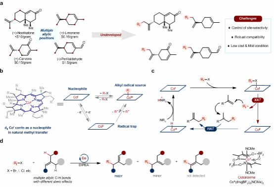 基于前期工作基礎(chǔ)(Nature Catal., 2022, 5, 642),雷愛(ài)文教授團(tuán)隊(duì)設(shè)想結(jié)合維生素B12催化的烷基轉(zhuǎn)移與鈷促進(jìn)的氫原子轉(zhuǎn)移過(guò)程來(lái)避免碳正離子消除的路徑,從而實(shí)現(xiàn)烯丙位的精準(zhǔn)氟烷基化。利用親核性的一價(jià)鈷與親電性的氟烷基試劑反應(yīng)產(chǎn)生氟烷基自由基,隨后氟烷基自由基與烯烴反馬氏加成,在鈷肟催化劑的氫原子轉(zhuǎn)移作用下得到烯丙位氟烷基化產(chǎn)物?;阝掚縃AT的選擇性,這一策略對(duì)于多種萜烯都展示出了單一的區(qū)域選擇性。