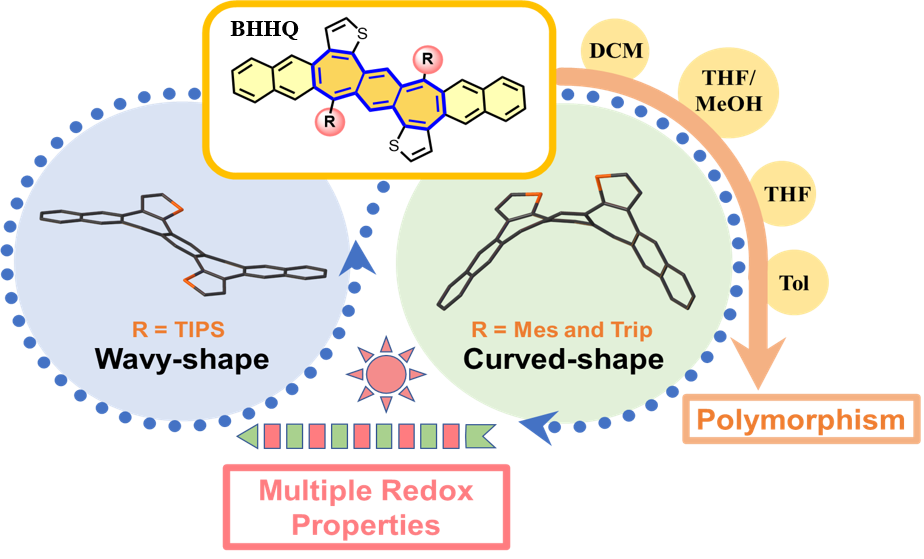 分子的構(gòu)象動(dòng)態(tài)多變性是含有七元環(huán)的共軛分子的重要特征之一,調(diào)控分子的構(gòu)象和動(dòng)態(tài)變化可以豐富其性能。張德清課題組合成了一類含醌式7/6/7環(huán)系的并七苯類似物(BHHQ),通過(guò)取代基策略和結(jié)晶條件誘導(dǎo)策略實(shí)現(xiàn)了分子的構(gòu)型從波浪(wavy)到彎曲(curved)的調(diào)控和互變,并且探索了該分子在溶劑氛圍響應(yīng)方面的應(yīng)用(圖2)。研究人員通過(guò)Aldo縮合反應(yīng)和Diels-Alder反應(yīng)等5步反應(yīng)高效、簡(jiǎn)潔的實(shí)現(xiàn)了一系列七元環(huán)上連接不同取代基的并七苯類似物(BHHQs)。研究發(fā)現(xiàn)取代基的大小能夠調(diào)控分子的構(gòu)型。三異丙基硅基乙炔(CC-TIPS)取代的化合物BHHQ-TIPS表現(xiàn)為波浪(wavy)構(gòu)型,而大位阻的三異丙基苯基(Trip)取代的化合物BHHQ-Trip表現(xiàn)出彎曲(curved)構(gòu)型。均三甲基苯基(Mes)取代的化合物BHHQ-Mes則表現(xiàn)出特殊的多晶型現(xiàn)象。通過(guò)改變結(jié)晶條件能夠得到五種不同構(gòu)型的多晶型A-E,實(shí)現(xiàn)了從較大程度的彎曲(curved)構(gòu)型,逐漸過(guò)渡到較小程度的彎曲(curved)構(gòu)型,再到波浪(wavy)構(gòu)型。BHHQ柔性的共軛骨架與溶劑分子之間強(qiáng)的相互作用還使得化合物BHHQ-Mes表現(xiàn)出特殊的溶劑響應(yīng)現(xiàn)象,在不同溶劑氛圍下熏蒸能夠?qū)崿F(xiàn)微晶固體顏色從亮黃色到深紅色的轉(zhuǎn)變,對(duì)應(yīng)的最大吸收波長(zhǎng)從478 nm紅移至501 nm。此外,BHHQ還表現(xiàn)出豐富的氧化還原特性。化合物BHHQ-Mes能夠在NOSbF6的氧化下生成陽(yáng)離子自由基或二價(jià)陽(yáng)離子,在KC8的還原下生成一價(jià)陰離子自由基1c·-。同中性態(tài)相比,1c·-中心六元環(huán)的芳香性增強(qiáng),構(gòu)型從彎曲(curved)轉(zhuǎn)變?yōu)椴ɡ耍╳avy)。相關(guān)研究成果發(fā)表在Angew. Chem. Int. Ed. 2023, 62, e202300990,第一作者是黃雁鷹博士,通訊作者是張德清研究員和張西沙副研究員。