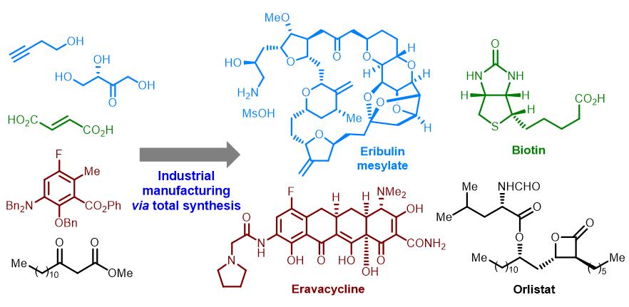 文章首先梳理了近50年來全球已實現(xiàn)商業(yè)化的天然藥物的工業(yè)全合成,包括前列腺素、艾日布林、依拉環(huán)素、生物素、奧利司他等;隨后介紹了目前已完成中試的代表性天然藥物的全合成;最后進(jìn)一步探討了有望通過全合成促進(jìn)來源稀缺的活性天然產(chǎn)物臨床研究的例子,以及新技術(shù)在天然藥物工業(yè)全合成中的應(yīng)用。通過該展望性論文,作者呼吁更多的藥物化學(xué)家關(guān)注和從事以臨床治療藥物需求為導(dǎo)向而開展天然產(chǎn)物全合成研究,通過可及、安全、經(jīng)濟(jì)的方式滿足復(fù)雜天然藥物的臨床需求。