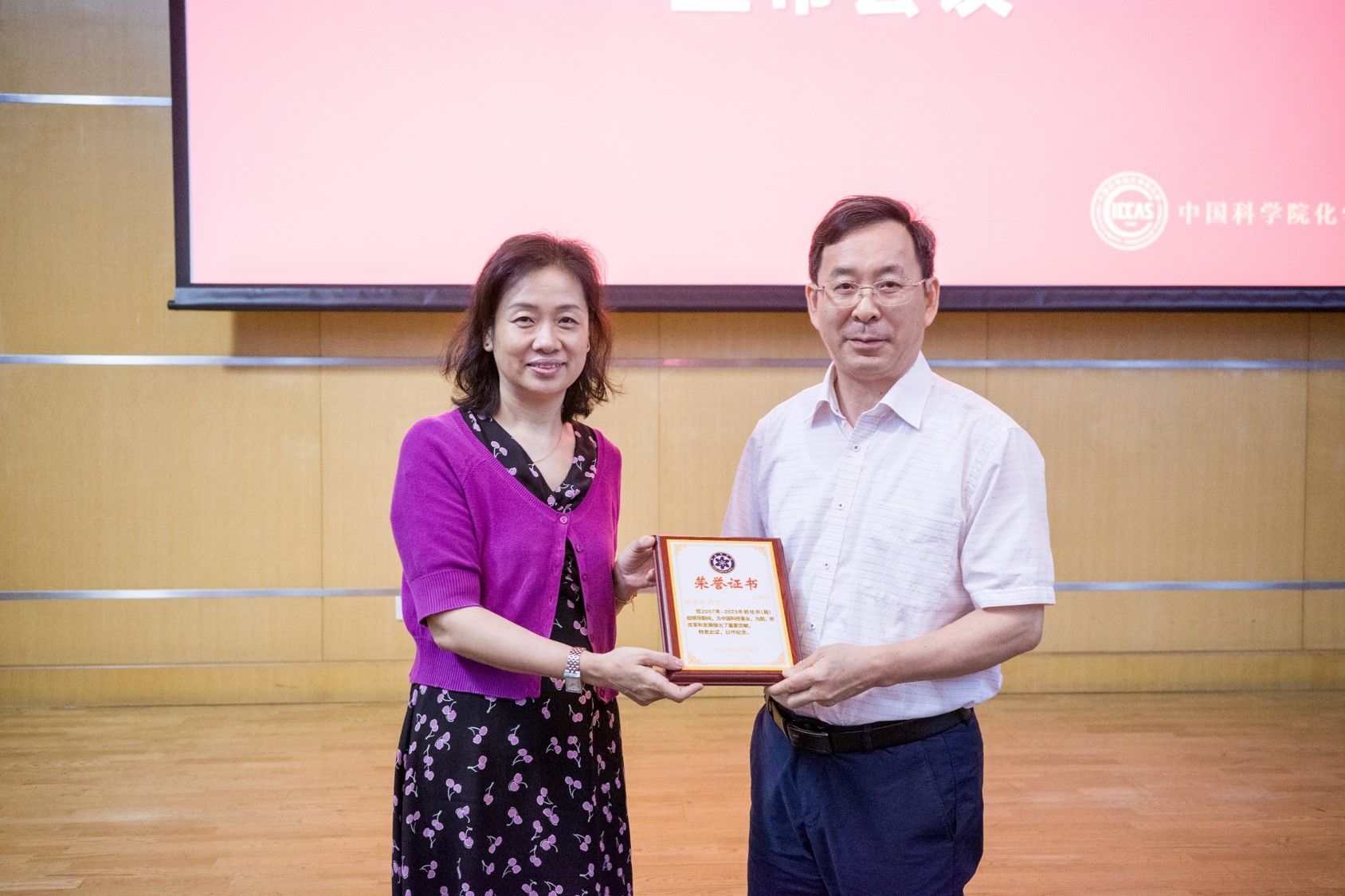 孫曉明代表院黨組向離任的所領(lǐng)導(dǎo)代表張德清頒發(fā)榮譽(yù)牌,感謝他們?yōu)橹袊?guó)科學(xué)院以及化學(xué)所科技創(chuàng)新和改革發(fā)展做出的重要貢獻(xiàn)。