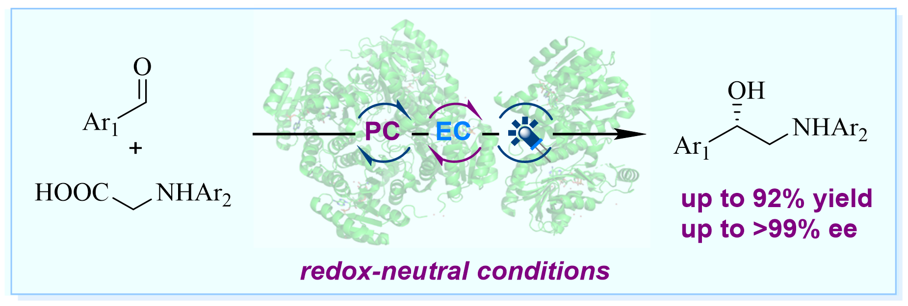 中國科學(xué)院天津工業(yè)生物技術(shù)研究所朱敦明研究員、吳洽慶研究員帶領(lǐng)的生物催化與綠色化工研究團(tuán)隊(duì)利用現(xiàn)有酶庫資源建立了氧化-還原中性的光酶催化體系,通過使用有機(jī)光敏劑曙紅Y(eosin Y)和來源于Ralstonia sp.細(xì)菌的脫氫酶RasADH組合,實(shí)現(xiàn)了N-芳基甘氨酸和醛之間的自由基碳-碳偶聯(lián)反應(yīng),高效、高立體選擇性地構(gòu)建了一系列1,2氨基醇產(chǎn)物。該反應(yīng)體系無需額外添加輔酶循環(huán)體系和還原犧牲試劑,相關(guān)機(jī)理研究實(shí)驗(yàn)表明該反應(yīng)經(jīng)歷了串聯(lián)的脫羧自由基偶聯(lián)和去對(duì)稱化過程。本工作為探索新的自由基偶聯(lián)反應(yīng)及生物活性分子的合成提供了新的思路。