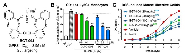 圖1. (A) BGT-004的結(jié)構(gòu);(B) BGT-004劑量依賴性地抑制GPR84激動劑6-OAU引起的小鼠單核細胞的趨化;(C) BGT-004劑量依賴性地緩解DSS誘導(dǎo)的小鼠急性潰瘍性腸炎。
