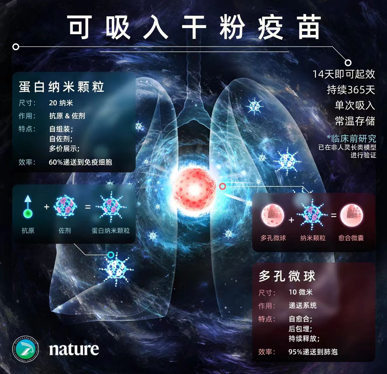 中國(guó)科學(xué)院院士、過(guò)程工程所生化工程國(guó)家重點(diǎn)實(shí)驗(yàn)室主任馬光輝及研究員魏煒團(tuán)隊(duì)基于多年均一微球制備及生物劑型工程的研究基礎(chǔ),提出了納微復(fù)合遞送新理念,并與軍事醫(yī)學(xué)研究院生物工程研究所研究員王恒樑及朱力團(tuán)隊(duì)合作,開(kāi)發(fā)了具有“納微復(fù)合”多級(jí)結(jié)構(gòu)的單劑干粉吸入式疫苗研制平臺(tái)技術(shù),可實(shí)現(xiàn)多種蛋白抗原疫苗的開(kāi)發(fā)與迭代。目前已在實(shí)驗(yàn)室成功制備出新型干粉吸入式疫苗,且在動(dòng)物模型上顯示出能夠高效阻斷呼吸道病毒的感染與傳播。相關(guān)工作于12月14日發(fā)表在《自然》(Nature)上(DOI:10.1038/s41586-023-06809-8)。