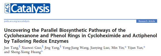 導(dǎo)讀:近日,云南大學(xué)醫(yī)學(xué)院尹敏課題組聯(lián)合中國科學(xué)院昆明植物研究所黃勝雄研究員課題組,在催化領(lǐng)域知名期刊ACS Catalysis上發(fā)表了題為“Uncovering the Parallel Biosynthetic Pathways of the Cyclohexanone and Phenol Rings in Cycloheximide and Actiphenol by Tailoring Redox Enzymes”的研究論文。該研究揭示了苯酚和環(huán)己酮在相同生物合成機制下形成的一種罕見且不同的級聯(lián)氧化還原機制,涉及由羧酸還原酶和CYP450協(xié)同催化PKS產(chǎn)物引發(fā)的分子內(nèi)羥醛縮合反應(yīng)。