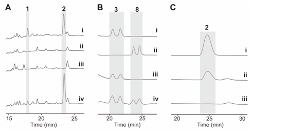 2:(A)野生型和突變株的HPLC圖譜。 (B) (iv) ChxJ與3孵育。 (C) ChxJ和ChxI與3孵育。
