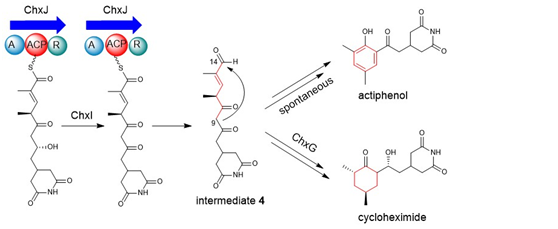 至此,CHX和APN的生物合成途徑的細節(jié),包括六元碳環(huán)系統(tǒng)的生物合成的新機制得到了完整解析。本研究表明,CHX和APN并非如先前推測的那樣由APN催化氫化產(chǎn)生CHX,而是自trans-AT PKS合成了碳骨架后,通過兩個平行的途徑分別產(chǎn)生的。兩種氧化還原酶ChxJ和ChxI可以單獨產(chǎn)生一種活性中間體,該中間體經(jīng)歷一系列非酶轉(zhuǎn)化以產(chǎn)生APN,而還原酶ChxG則作為看門人,將同一中間體引導(dǎo)到產(chǎn)生CHX的合成途徑。該研究對作者團隊于2014年提出的假設(shè)(Yin et al. Org Lett, 2014)進行了進一步修正,擴展了對天然產(chǎn)物生物合成中氧化還原酶介導(dǎo)的酚和環(huán)己酮基團形成的理解,并為未來的組合生物合成研究奠定了基礎(chǔ)。