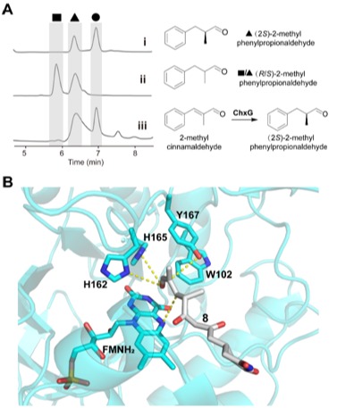 ChxJ和ChxI的組合足以產(chǎn)生APN,而ChxH和ChxG對于CHX的生物合成至關(guān)重要,這與作者早期的體內(nèi)敲除實驗結(jié)果一致。ChxH負責(zé)CHX生物合成途徑的最后一步已經(jīng)在先前報道的文章中證實,接下來重點研究ChxG。實驗結(jié)果顯示,化合物8能被ChxG還原為化合物9(圖3A),這表明ChxG在CHX生物合成中的作用是介導(dǎo)不穩(wěn)定的醛化合物4的C12-C13雙鍵還原,生成新的中間體10,該中間體隨后可自發(fā)進行醛醇縮合脫水生成113B、圖4。隨后將ChxJ、ChxI和ChxG組合在一起,以3為底物進行了一鍋反應(yīng),證明了化合物4是ChxG的真實底物(圖3C)。而化合物11可以在非酶催化條件下轉(zhuǎn)化為化合物6(圖3D)。此外,找到了一個ChxG的同源蛋白,并通過體外實驗驗證了其具有ChxG相同的活性。驗證了ChxG在底物還原過程中的立體選擇性與天然放線菌酮生物合成過程中C12和C13雙鍵還原時的立體選擇性是一致的(圖5A)。最后,通過分子模擬對接分析以及后續(xù)點突變蛋白的構(gòu)建,證明了氨基酸H162、H165和Y167對ChxG的還原活性起著至關(guān)重要的作用(圖5B)。
