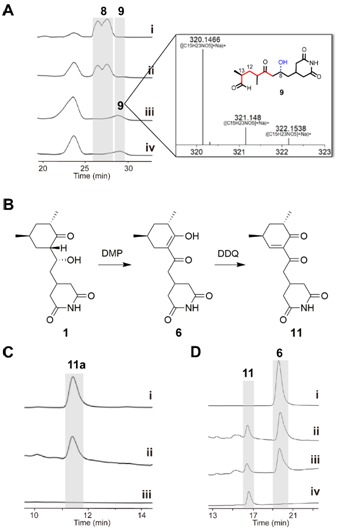 ChxG化合物8生成9。 (B由化合物1(CHX)化學(xué)合成化合物11和6。C) ChxI、ChxJ和ChxG3孵育,11易于發(fā)生酮烯醇互變異構(gòu)11a。D NADPH在添加或不添加ChxG的情況下分別與11共孵育。