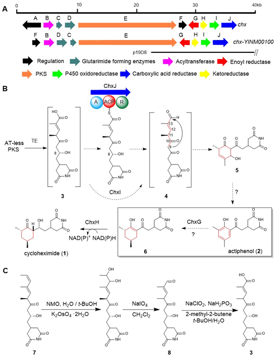 1:(A) chx和chx- YINM00100 BGC的基因簇比較。(B)前期研究提出的CHX和APN的生物合成途徑。(C)由化合物7化學(xué)合成化合物3和8