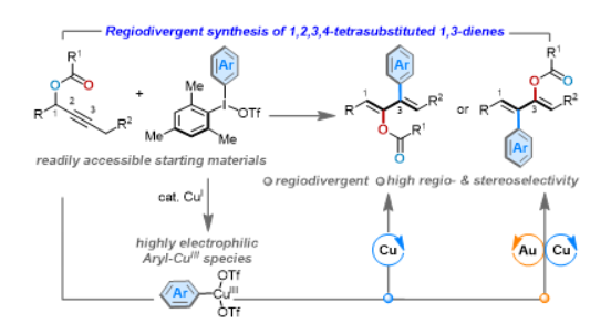 近日,南京師范大學(xué)陳良安教授團隊開發(fā)了一種催化劑控制的區(qū)域發(fā)散式合成策略,實現(xiàn)了廉價易得的炔丙醇酯與二芳基碘鎓鹽向高附加值的1,2,3,4-四取代共軛二烯的區(qū)域、立體與化學(xué)選擇性轉(zhuǎn)化。相關(guān)研究成果發(fā)表...