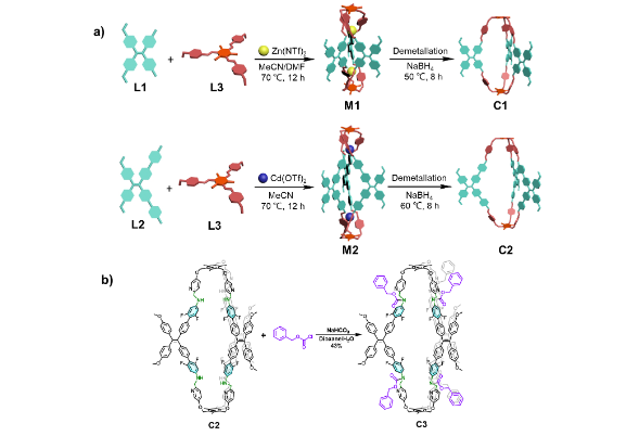 近期,華東師范大學(xué)徐林教授課題組與深圳大學(xué)王東教授、香港中文大學(xué)(深圳)唐本忠院士課題組合作,通過“組裝-還原-后修飾”策略,從配位鍵導(dǎo)向自組裝構(gòu)筑金屬籠出發(fā),再通過還原脫金屬-共價后修飾高效制備了一...