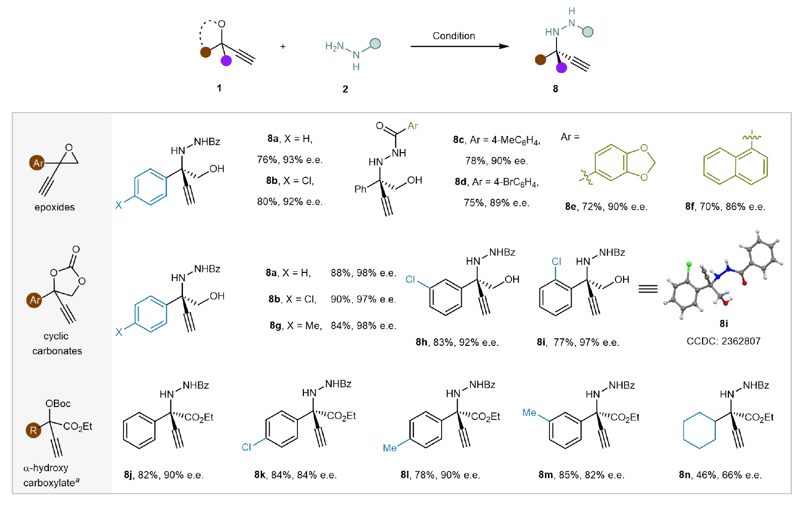 華東師大周劍和周鋒教授團(tuán)隊(duì)基于所發(fā)展的兼具大位阻功能基和手性傳導(dǎo)基的空間受限PYBOX配體,實(shí)現(xiàn)了高底物普適性和高對(duì)映選擇性的簡(jiǎn)單酮衍生炔丙醇酯的不對(duì)稱炔丙基肼化反應(yīng),為α-季碳手性肼類化合物的合成提...