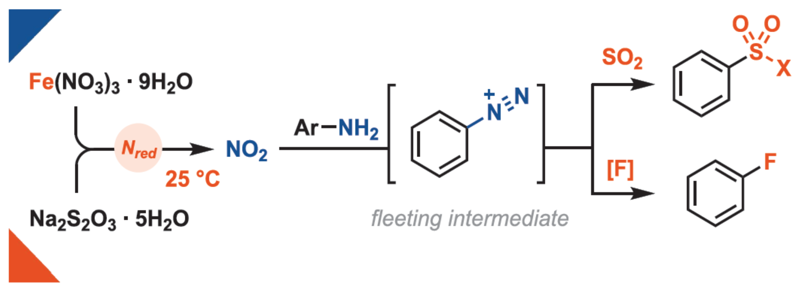 近日,德國(guó)馬克斯·普朗克研究所Tobias Ritter課題組報(bào)道了一種基于常溫下硝酸鐵還原原位生成重氮鹽的方法,實(shí)現(xiàn)了苯胺的直接脫氨基氯磺酰化(chlorosulfonylation)和氟化反應(yīng),涉...