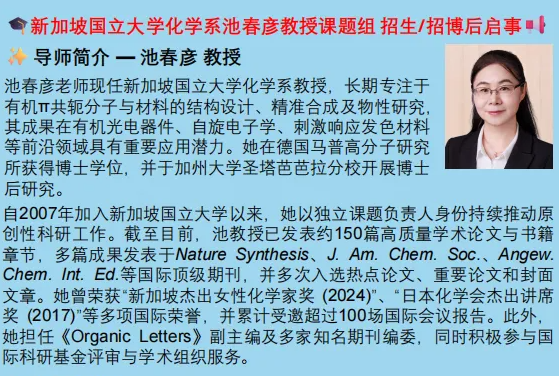 池教授團(tuán)隊(duì)氛圍開放、包容且富有創(chuàng)新精神,擁有先進(jìn)的實(shí)驗(yàn)平臺(tái)與廣泛的國際合作平臺(tái)。她歡迎對(duì)有機(jī)合成、材料科學(xué)、自旋電子學(xué)等方向充滿熱情、立志在世界科研前沿有所突破的優(yōu)秀博士生加入,共同在化學(xué)與材料交叉領(lǐng)...