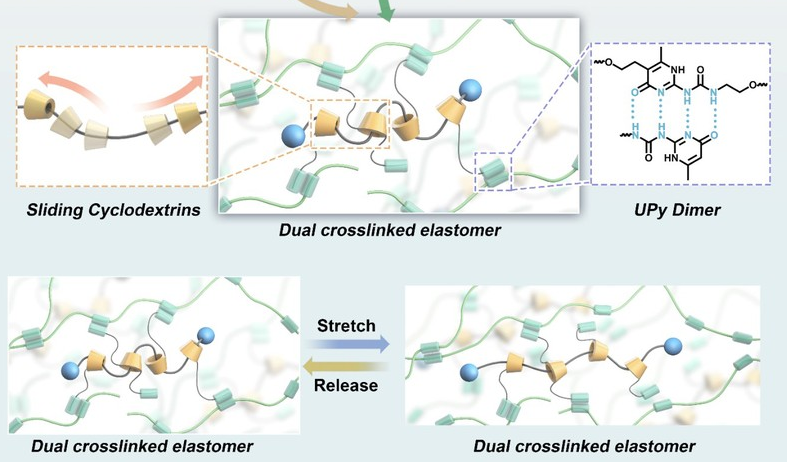 近日,南京大學(xué)賈敘東教授、張秋紅副教授團(tuán)隊和汪蓉教授團(tuán)隊合作,將四重氫鍵和聚輪烷同時引入到聚氨酯彈性體中,利用動態(tài)四重氫鍵作用和聚輪烷的滑環(huán)效應(yīng)成功制備了具有高韌性(77.3 MJ/m3) 和室溫自修...