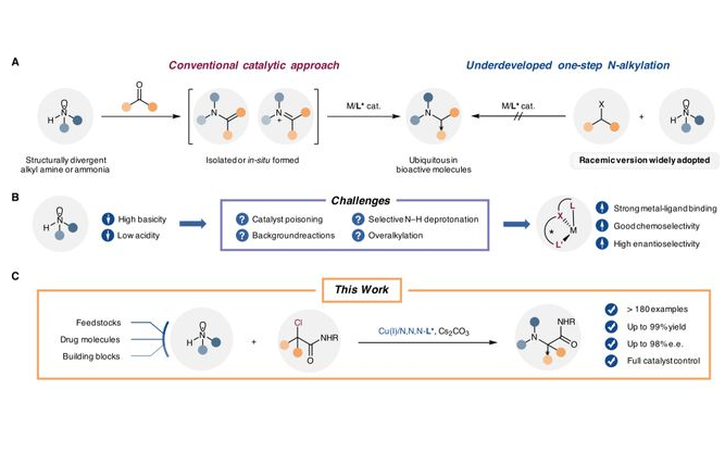 近日,南方科技大學(xué)劉心元團(tuán)隊報道了銅/手性三齒陰離子配體催化烷基胺的立體匯聚式N-烷基化反應(yīng),該方法可以在溫和的條件下將各種工業(yè)原料胺、含胺藥物分子甚至氨直接一步轉(zhuǎn)化為非天然手性α-氨基酸衍生物,具有...