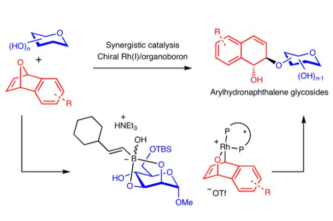 Charles C. J. Loh課題組利用銠/硼酸協(xié)同催化策略,高立體選擇性的實現(xiàn)了生物學相關(guān)的芳基萘糖苷化合物的合成。此策略成功的關(guān)鍵是選擇合適的有機硼作為共催化劑,使具有前手性的氧雜降冰片二烯同...