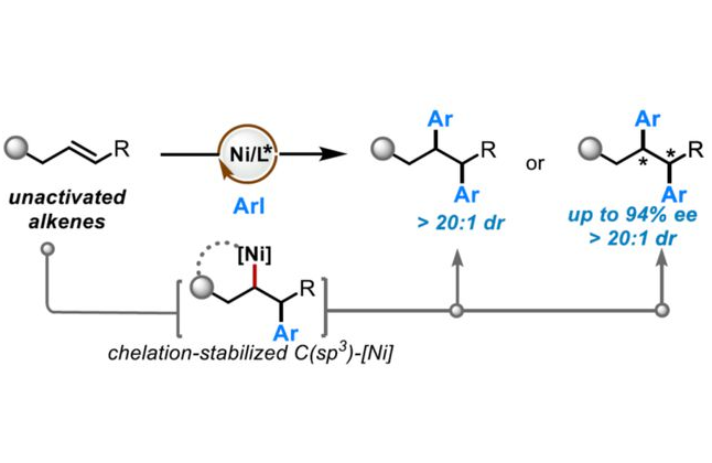 近日,南京師范大學(xué)陳良安課題組與南京林業(yè)大學(xué)宋亮亮報道了一種非活化烯烴的導(dǎo)向鎳催化還原1,2-二芳基化反應(yīng),具有優(yōu)秀的非對映選擇性。同時,通過手性配體的調(diào)控,一系列非活化末端和內(nèi)烯烴均可順利進(jìn)行對映選...