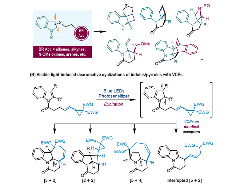中科院上海有機所金屬有機化學(xué)國家重點實驗室游書力研究員團隊一直致力于發(fā)展可見光介導(dǎo)的去芳構(gòu)化反應(yīng)。近期,該團隊發(fā)展了可見光的條件下激發(fā)態(tài)吲哚/吡咯與乙烯基環(huán)丙烷(VCP)的去芳構(gòu)化環(huán)加成反應(yīng)(J. A...