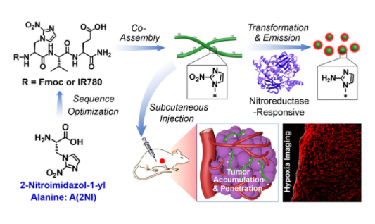 南開大學(xué)化學(xué)學(xué)院余志林課題組報道了一種具有NTR-響應(yīng)的非經(jīng)典氨基酸,可在腫瘤乏氧區(qū)域基于硝基還原有效調(diào)控多肽組裝,同時開啟納米結(jié)構(gòu)熒光特性,實現(xiàn)實體瘤乏氧區(qū)域的熒光成像檢測。該成果發(fā)表于J. Am....
