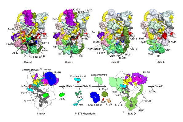 中國科學(xué)院生物物理研究所葉克窮課題組利用單顆粒冷凍電鏡技術(shù)解析了酵母核糖體小亞基早期前體向晚期前體轉(zhuǎn)化過程中的一系列過渡狀態(tài)的結(jié)構(gòu),首次觀察到該轉(zhuǎn)化的動態(tài)分子過程。該成果"Cryo-EM ...
