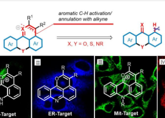 四川大學化學學院游勁松課題組利用C=X (X = N, O, S, N-R)與炔烴的氧化環(huán)化反應,高效構建含雜原子的多環(huán)芳烴熒光分子庫。通過調節(jié)氮原子的化學環(huán)境實現(xiàn)了不同類型分子能分別對溶酶體、內質網...