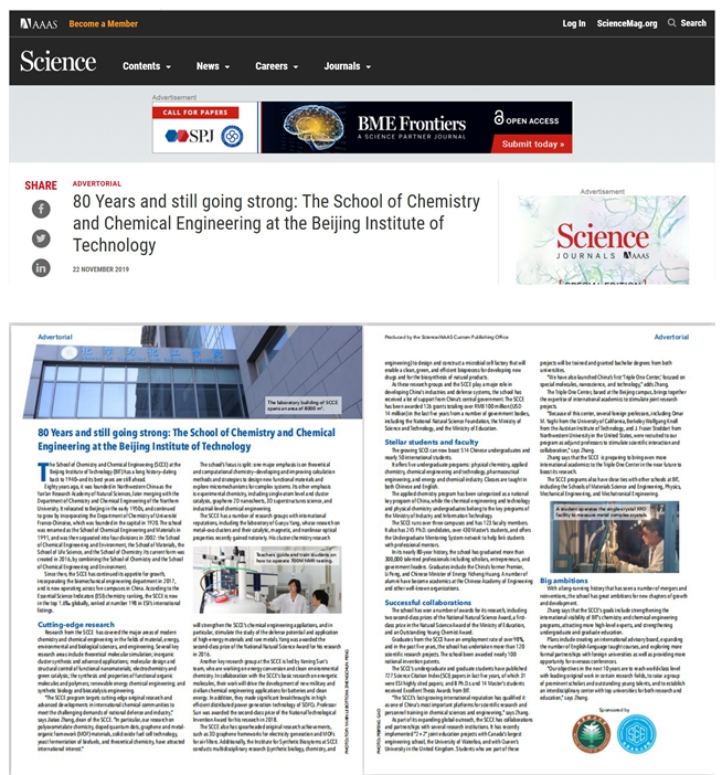 11月22日,《Science》在其Advertorials欄目專題報道了北理工化學(xué)與化工學(xué)院發(fā)展建設(shè),詳細(xì)介紹了學(xué)院的學(xué)科布局與發(fā)展、科學(xué)研究、國際化建設(shè),并對2016年榮獲國家自然科學(xué)二等獎的楊國...
