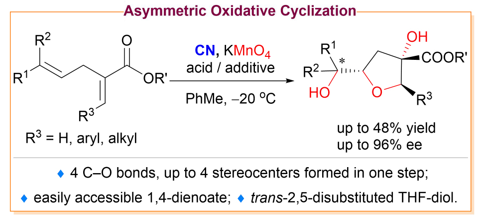四氫呋喃結(jié)構(gòu)單元在海洋天然產(chǎn)物和具有重要藥用價(jià)值的分子中廣泛存在。近日,南京工業(yè)大學(xué)/華僑大學(xué)王超團(tuán)隊(duì)報(bào)道了一種多手性中心四氫呋喃結(jié)構(gòu)的高效合成方法:以高錳酸鉀為氧化劑,金雞納堿季銨鹽為手性相轉(zhuǎn)移催化...