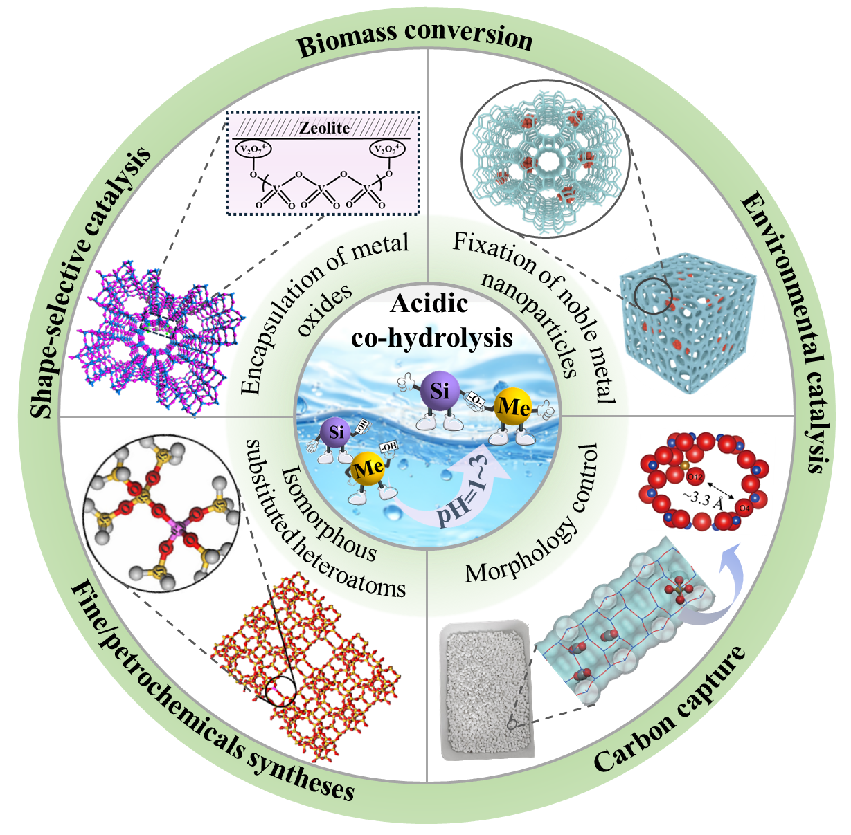 開發(fā)了一種獨(dú)特的酸水解策略(ACH):在弱酸條件下,金屬與硅源前驅(qū)體經(jīng)過緩慢水解、縮合生成Me-O-Si單元,再調(diào)pH值至堿性形成沸石凝膠,晶化制備得到Me-沸石。該方法匹配金屬和硅源的水解速率,有效...