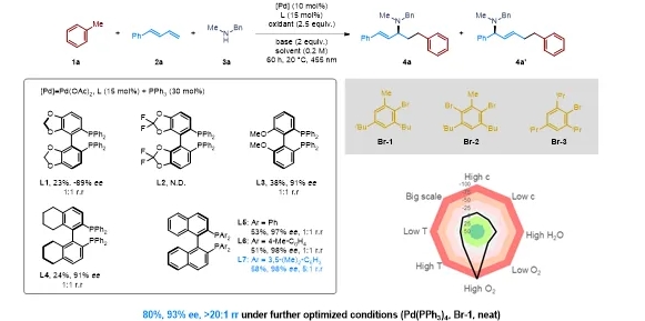 近期,中國科學(xué)技術(shù)大學(xué)龔流柱、韓志勇團(tuán)隊(duì)報道了光照條件下鈀催化烷烴等參與的1,3-二烯的不對稱烷胺化反應(yīng),使用手性鈀作為催化劑,芳基溴作為間接HAT試劑,從含有碳(sp3)?氫鍵的化合物出發(fā)合成手性烯...