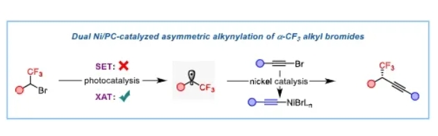 手性α-CF3炔烴化是一類非常重要的合成,CF3基團(tuán)的引入能夠極大改變分子的生物活性。炔基有豐富的官能團(tuán)轉(zhuǎn)化潛力,且可以作為“點(diǎn)擊化學(xué)”的把手,因此,炔烴化是快速構(gòu)建先導(dǎo)化合物庫的重要方式。三維立體結(jié)...