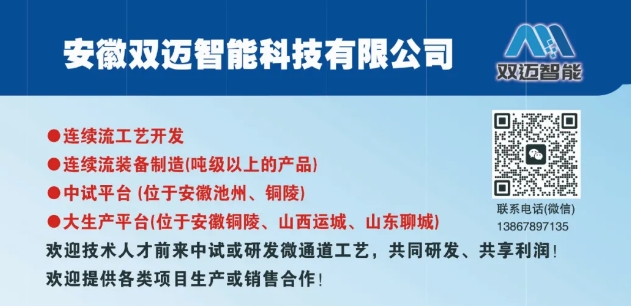 安徽雙邁智能科技有限公司,連續(xù)流工藝開發(fā),連續(xù)流裝備制造(噸級以上的產(chǎn)品),擁有中試平臺(位于安徽池州、銅陵)和大生產(chǎn)平臺(位于安徽銅陵、山西運(yùn)城、山東聊城)。歡迎技術(shù)人才前來中試或研發(fā)微通道工藝,共...
