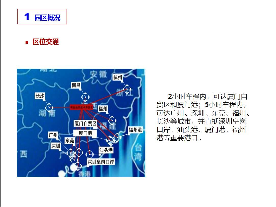 瑞金經(jīng)濟技術開發(fā)區(qū)前身為江西瑞金經(jīng)濟開發(fā)區(qū),創(chuàng)建于2002年5月,2012年4月江西省人民政府批準為省級經(jīng)濟開發(fā)區(qū),2013年11月20日國務院批準為國家級經(jīng)濟技術開發(fā)區(qū)。開發(fā)區(qū)由臺商創(chuàng)業(yè)園、金沙工業(yè)區(qū)、金龍工業(yè)區(qū)三部分組成,其中江西瑞金臺商創(chuàng)業(yè)園是核心區(qū),于2008年9月經(jīng)國務院臺灣事務辦公室和江西省人民政府批準設立。瑞金經(jīng)濟技術開發(fā)區(qū)是全國“農(nóng)業(yè)產(chǎn)業(yè)化示范基地”、“鰻魚、螺旋藻加工出口示范基地”、江西省“十百千億”工程重點工業(yè)園區(qū)和省級民營科技園。 開發(fā)區(qū)總規(guī)劃面積43平方公里,規(guī)劃面積11平方公里,重點發(fā)展電氣機械及器材制造業(yè)、食品藥品加工業(yè)和礦產(chǎn)品加工業(yè)。按照“項目集中、產(chǎn)業(yè)集群、土地集約、功能集成”的發(fā)展原則,開發(fā)區(qū)累計投入建設資金6.8億元,完成了11平方公里的控制性詳細規(guī)劃和生態(tài)園區(qū)建設規(guī)劃,開發(fā)面積約8500畝,建成了“四橫三縱”主干路網(wǎng)及標準廠房約25萬平方米,綠化、亮化、供水、供電、排水、排污等配套設施建設基本完善,并已啟動了勝利大道、經(jīng)三路、金鑫二路、創(chuàng)業(yè)一路等9條道路以及工業(yè)污水處理設施建設。截止目前,開發(fā)區(qū)共有落戶企業(yè)153家,其中已投產(chǎn)企業(yè)115家。